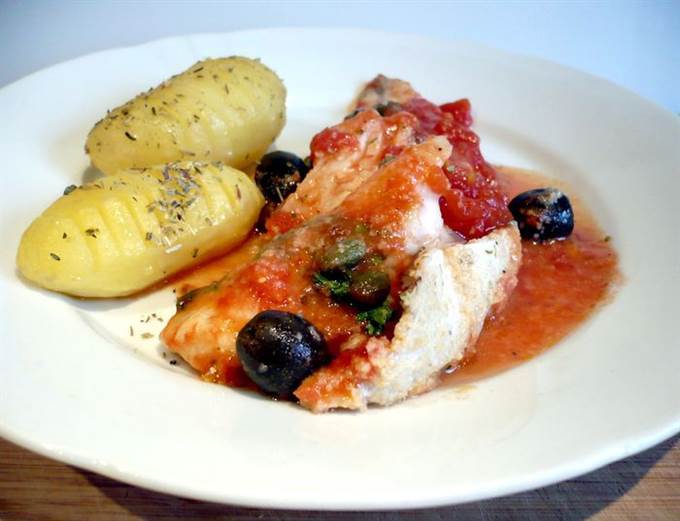 Рыбка, запеченная в томатном соусе с маслинами и каперсами