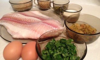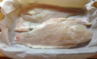• Противень застелить пергаментом. Выложить филе рыбы. Сверху положить смесь орехов, зелени и петрушки.