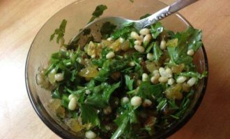 • В миске смешать кедровые орехи, соль, перец, изюм, петрушку и оливковое масло. Разогреть духовку до 190 градусов.