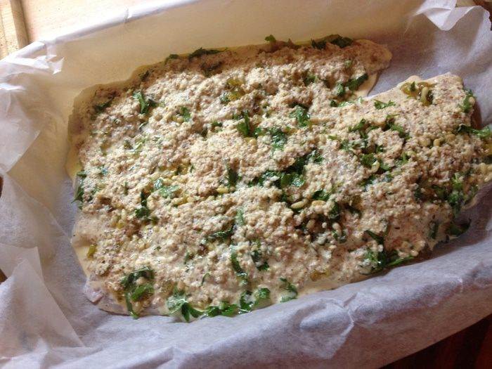 • Противень застелить пергаментом. Выложить филе рыбы. Сверху положить смесь орехов, зелени и петрушки.