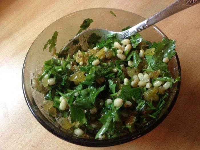 • В миске смешать кедровые орехи, соль, перец, изюм, петрушку и оливковое масло. Разогреть духовку до 190 градусов.