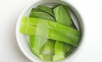 От стебля лука порея отделить зеленые листья и на 2-3 минуты опустить их в кипящую подсоленную воду, после хорошо промыть холодной водой (для сохранения цвета).