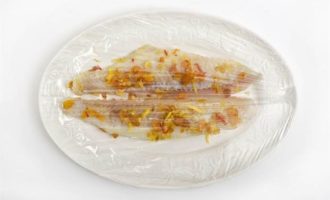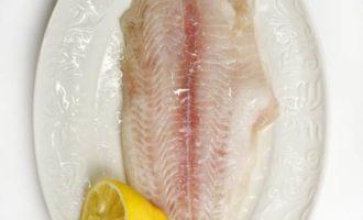 Рыбное филе сбрызнуть лимонным соком и оливковым маслом, накрыть пищевой пленкой и на 10 минут поместить в холодильник.
