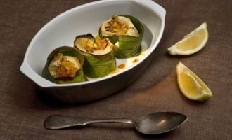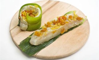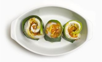 Листья лука порея выложить на разделочную доску, сверху на каждый лист поместить рыбное филе и аккуратно свернуть рулетики.