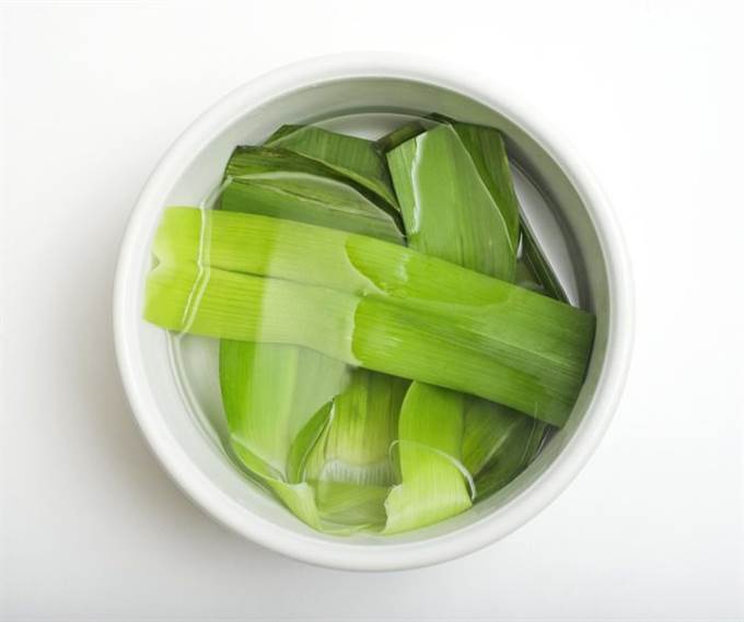 От стебля лука порея отделить зеленые листья и на 2-3 минуты опустить их в кипящую подсоленную воду, после хорошо промыть холодной водой (для сохранения цвета).