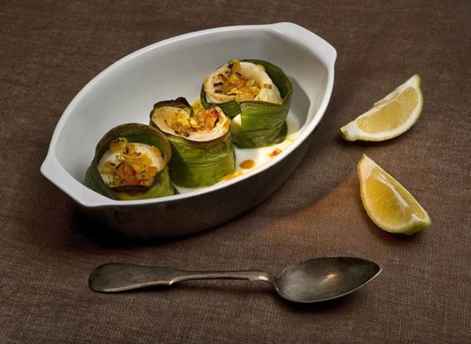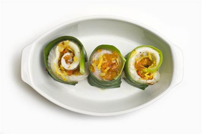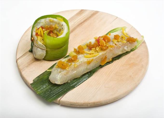 Листья лука порея выложить на разделочную доску, сверху на каждый лист поместить рыбное филе и аккуратно свернуть рулетики.