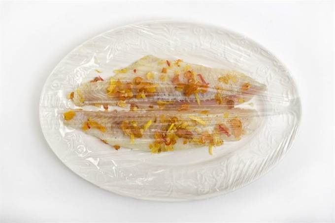 Рыбное филе сбрызнуть лимонным соком и оливковым маслом, накрыть пищевой пленкой и на 10 минут поместить в холодильник.