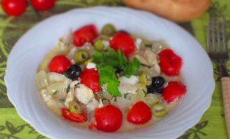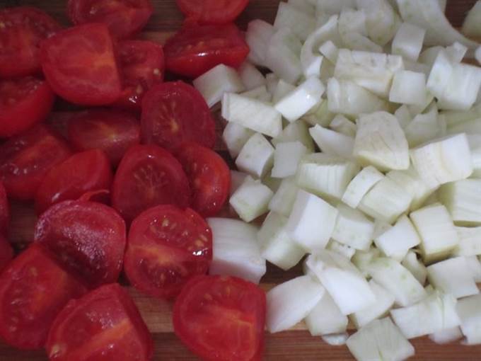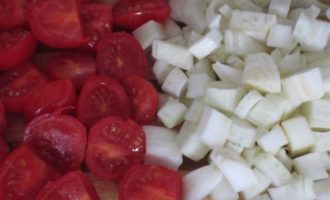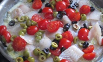 Помидоры разрезать пополам, фенхель -кубиками, оливки-колечками.