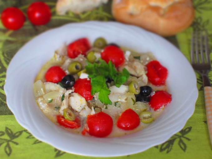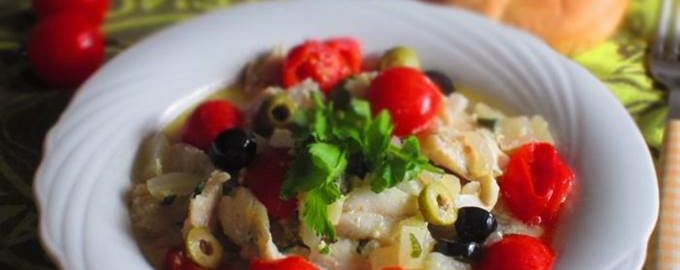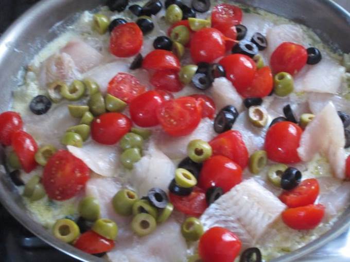 Добавить карри, йогурт, помидоры, оливки, рыбу, измельчённую зелень, посолить, поперчить и томить под крышкой 15 минут.
