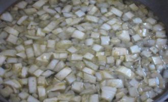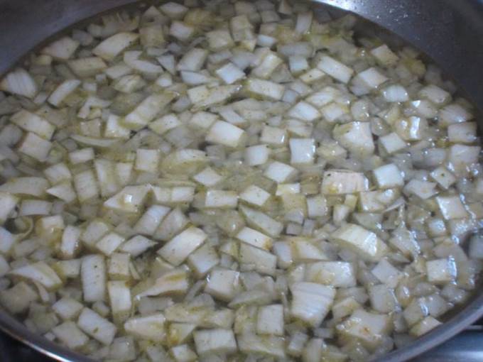 Добавить к луку фенхель, влить бульон и тушить на среднем огне 20 минут.