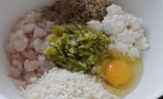 Рыбное филе нарезать не очень крупным кубиком, добавить творог, хлебные крошки, молотые грецкие орехи, яйцо и обжаренный на растительном масле лук-порей. Добавить соль и молотый перец по вкусу. По желанию можно добавить зелень.