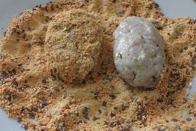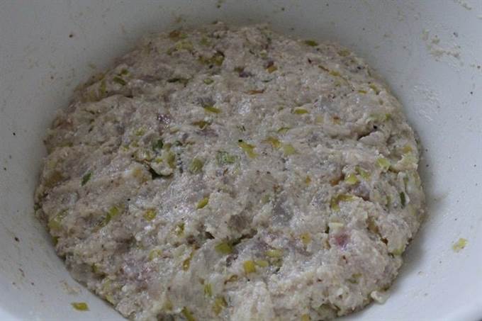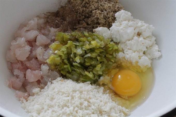 Рыбное филе нарезать не очень крупным кубиком, добавить творог, хлебные крошки, молотые грецкие орехи, яйцо и обжаренный на растительном масле лук-порей. Добавить соль и молотый перец по вкусу. По желанию можно добавить зелень.