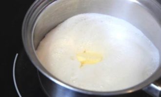Доводим молоко до кипения и кидаем туда кусочек сливочного масла.