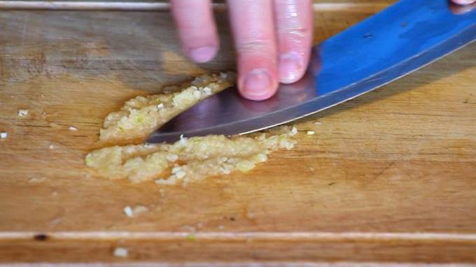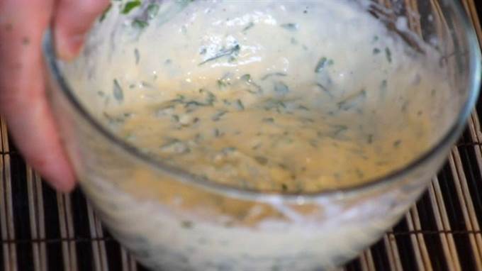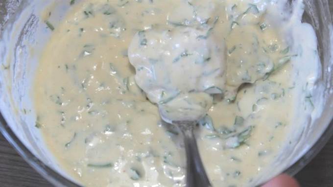 Делаем кляр для трески. Смешиваем муку, молоко с маслом, чеснок и петрушку. Консистенция должна быть как у жирной сметаны. Солим, перчим.