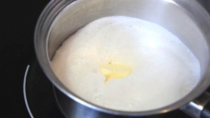 Доводим молоко до кипения и кидаем туда кусочек сливочного масла.