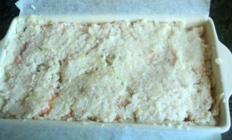 • Форму размером 20х10 см застелить бумагой для выпечки, смазать растительным маслом. Выложить половину рыбно- рисовой массы и равномерно распределить ее по дну и стенках формы.