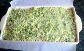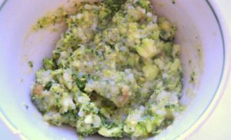 • К оставшейся 1/3 рыбно рисовой массы добавить измельченную брокколи и желтки, хорошо перемешать.