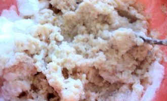 • Белки взбить со щепоткой соли до устойчивых пиков. Добавить 1/3 белков к рыбно-рисовой массе. Осторожно перемешать ложкой.