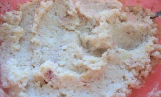 • Отварить до готовности рис, воду слить, но не промывать. Еще теплым рис пюрировать в блендере. Охладить. Лук мелко порезать и пассировать на растительном масле до мягкости, охладить. К измельченному филе белой рыбы добавить рис, пассированный лук, 70 мл сливок, кориандр, соль, перец по вкусу, хорошо перемешать.
