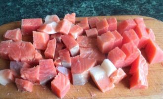 • Филе семги порезать на небольшие кусочки и подморозить в морозилке в течении 15 минут.