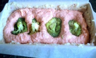 • Сверху равномерно выложить 2/3 оставшейся белой рыбной массы, хорошо заполняя промежутки между черешками брюссельской капусты.