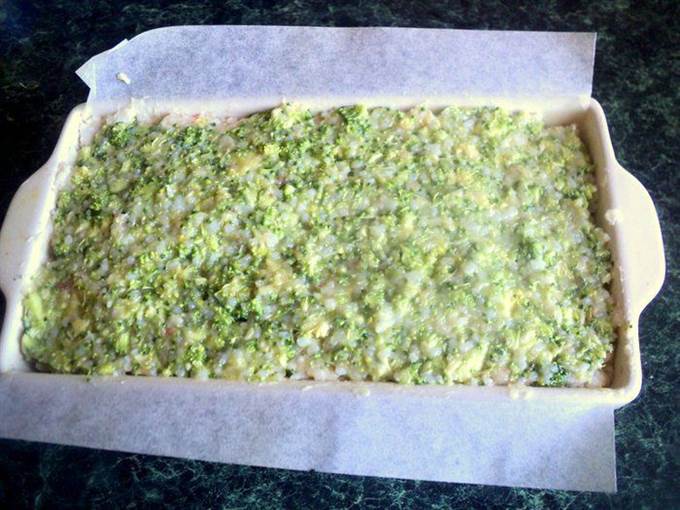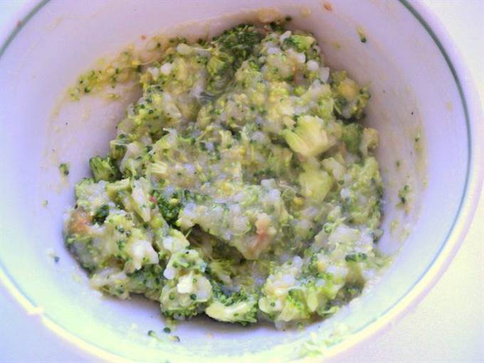 • К оставшейся 1/3 рыбно рисовой массы добавить измельченную брокколи и желтки, хорошо перемешать.