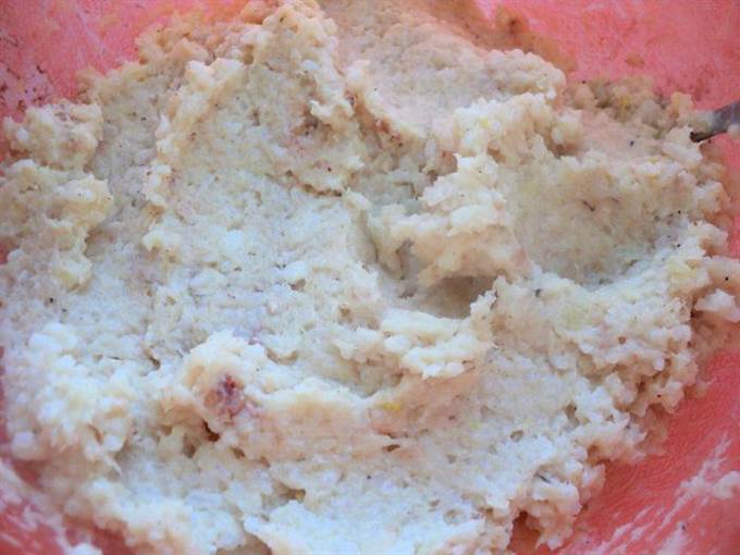 • Отварить до готовности рис, воду слить, но не промывать. Еще теплым рис пюрировать в блендере. Охладить. Лук мелко порезать и пассировать на растительном масле до мягкости, охладить. К измельченному филе белой рыбы добавить рис, пассированный лук, 70 мл сливок, кориандр, соль, перец по вкусу, хорошо перемешать.