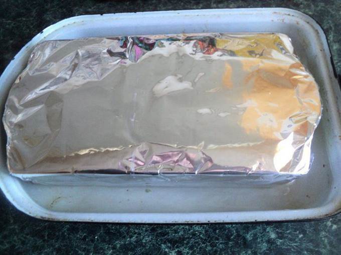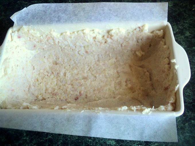 • Выложить эту массу верхним слоем. Несколько раз постучать формой об стол, чтобы масса уплотнилась.