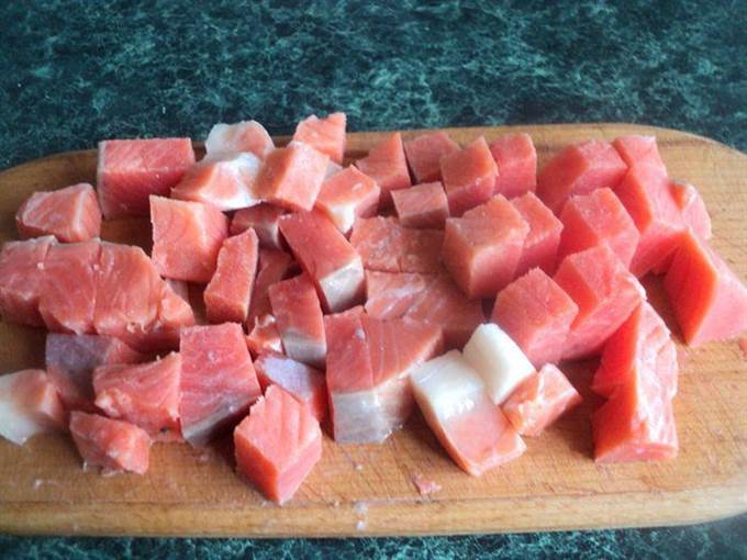 • Филе семги порезать на небольшие кусочки и подморозить в морозилке в течении 15 минут.