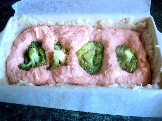 • Сверху равномерно выложить 2/3 оставшейся белой рыбной массы, хорошо заполняя промежутки между черешками брюссельской капусты.