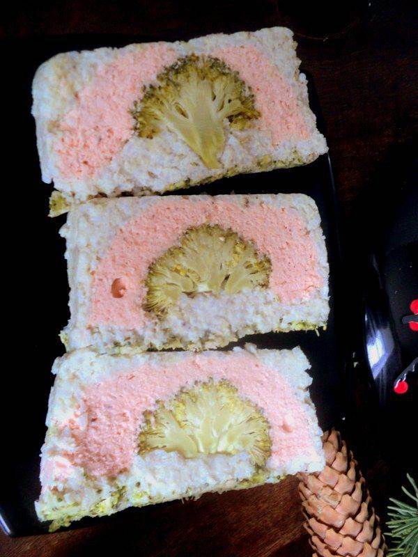 • Выложить массу из красной рыбы в форму. Брокколи разобрать на черешки. Несколько крупных черешков воткнуть в массу из семги, это будут наши деревья сакуры.