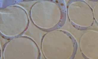 Тесто поделить на несколько кусков, каждый кусок у отдельности раскатать, стаканом любого диаметра вырезать кружочки.