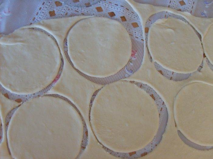 Тесто поделить на несколько кусков, каждый кусок у отдельности раскатать, стаканом любого диаметра вырезать кружочки.