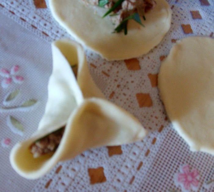 Муку просеять, сделать в ней углубление, добавить размягченное слив. масло, в этом случае я всегда использую домашнее желтое масло, соль и горячую воду и замесить некрутое пресное тесто. Дать ему отдохнуть минут 20.