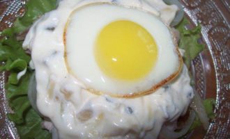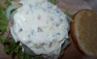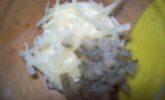 Отдельно в миске смешиваем майонез, сыр, маринованные огурцы (можно добавить мелконарезанный лук.
