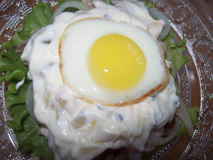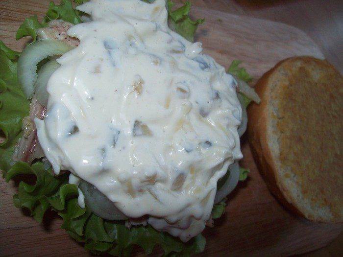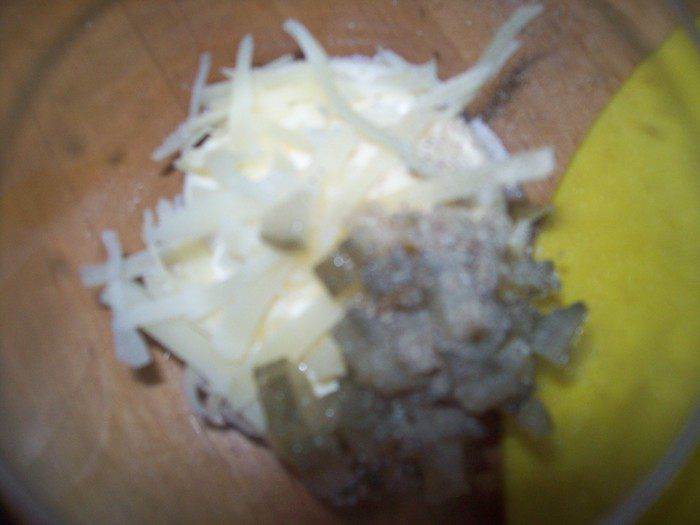 Отдельно в миске смешиваем майонез, сыр, маринованные огурцы (можно добавить мелконарезанный лук.