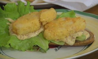 Сэндвич с рыбой в кляре и листьями салата