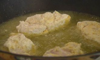 • Рыбу нарезать небольшими кусочками, каждый кусочек опустить в кефир, а затем обвалять со всех сторон в муке.