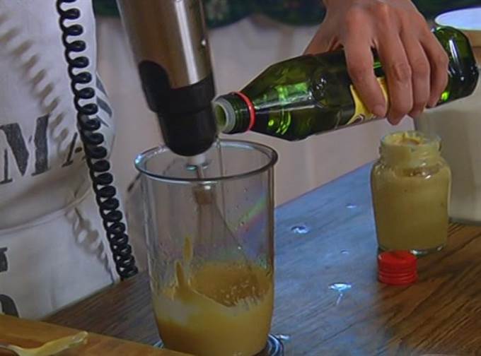 • Приготовить майонез: желток соединить с горчицей, лимонным соком и солью и взбивать миксером, тонкой струйкой вливая оливковое масло. В самом конце влить винный уксус и все перемешать.