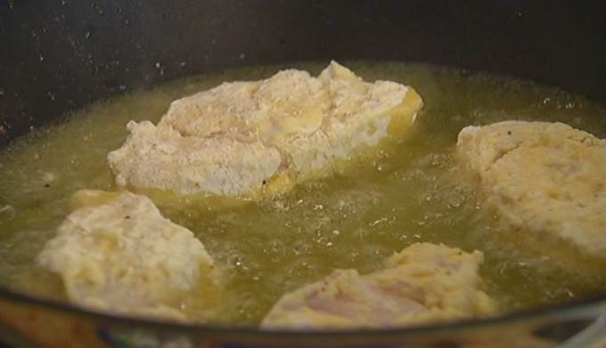 • В глубокой сковороде разогреть оливковое масло и обжарить в нем кусочки рыбы со всех сторон до золотистой корочки — как во фритюре. Обжаренную рыбу выложить на бумажное полотенце, чтобы убрать излишки жира.