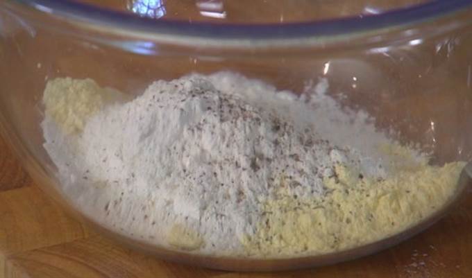 • Соединить оба вида муки, соль и перец.