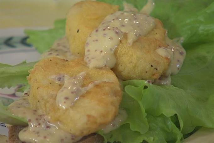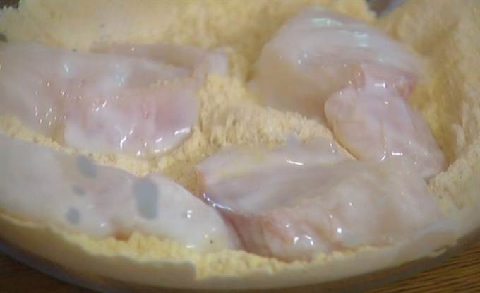 • Рыбу нарезать небольшими кусочками, каждый кусочек опустить в кефир, а затем обвалять со всех сторон в муке.