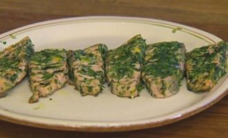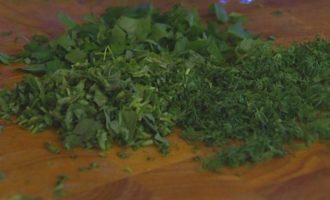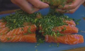 Обвалять семгу в измельченной зелени и оставить мариноваться (можно поставить на час в холодильник).