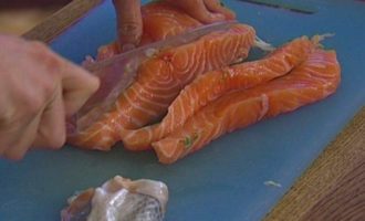 Семгу отделить от кожи и нарезать полосками шириной 1,5 см.