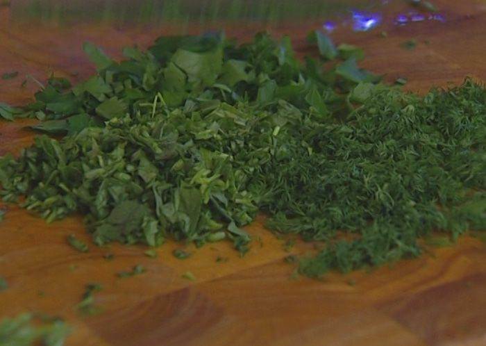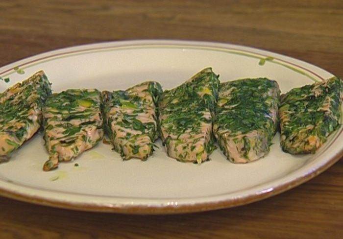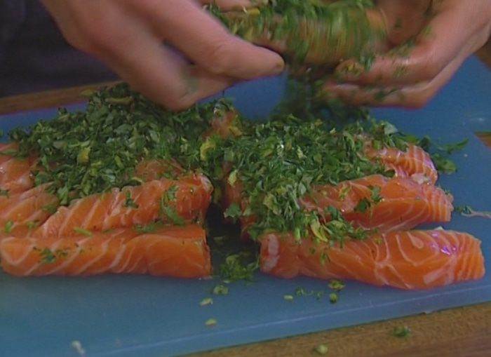 Обвалять семгу в измельченной зелени и оставить мариноваться (можно поставить на час в холодильник).