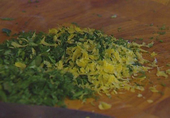 Соединить цедру с зеленью, посолить, поперчить и все перемешать.