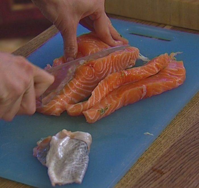 Семгу отделить от кожи и нарезать полосками шириной 1,5 см.