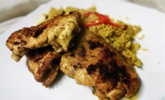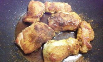 У меня были куриные бедра без костей, им хватило до готовности 20 минут. Когда мясо готово, увеличить огонь и обжарить кусочки курицы до хрустящей корочки. Мясо готово, рис тоже.