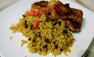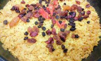 За это время рис впитает жидкость. Добавить изюм и чили, заправить соком лайма и, если необходимо, посолить. Выключить огонь и дать рису настояться.