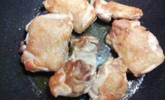 Курицу порубить на порционные кусочки. Разогреть оливковое масло и обжарить курицу со всех сторон до золотистой корочки.